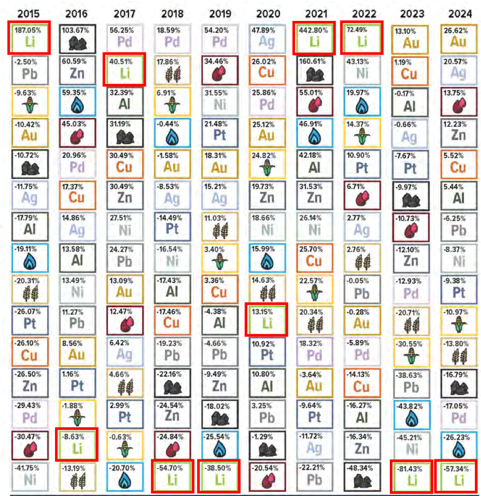 I’ve been writing about Li stocks for a decade, there have been several boom/bust pricing cycles. In the following chart, notice that Li has been the top or second best performer four times, and the worst or second worst performer five times in the past 11 years!