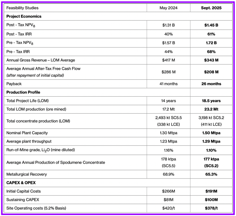 Cap-ex of US$191M is not a big hurdle, especially with low-cost loans, free-money grants, and partially pre-paid off-take agreements possibly on the table. As is the case with other Li project studies, the long-term Li spodumene concentrate (“spod con”) price assumption of $2,200/t is well above the current spot price.