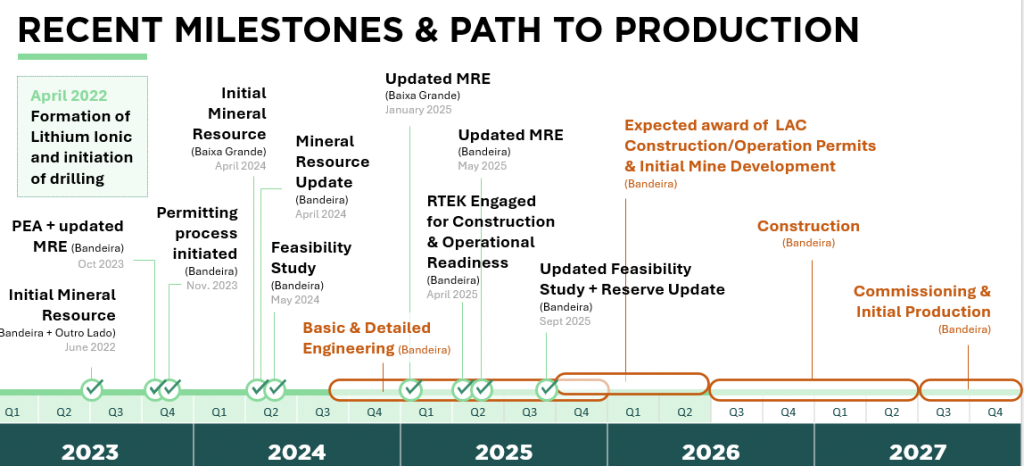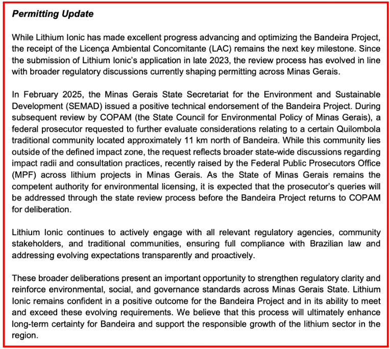 Lithium Ionic will need to raise equity capital, which will be dilutive to shareholders. On September 25th management announced a C$15M (upsized) equity raise which is currently open. The Company recently pushed back the anticipated start date of operations until 2H 2027. Obtaining permits to operate in Brazil is expected, but timing is uncertain.