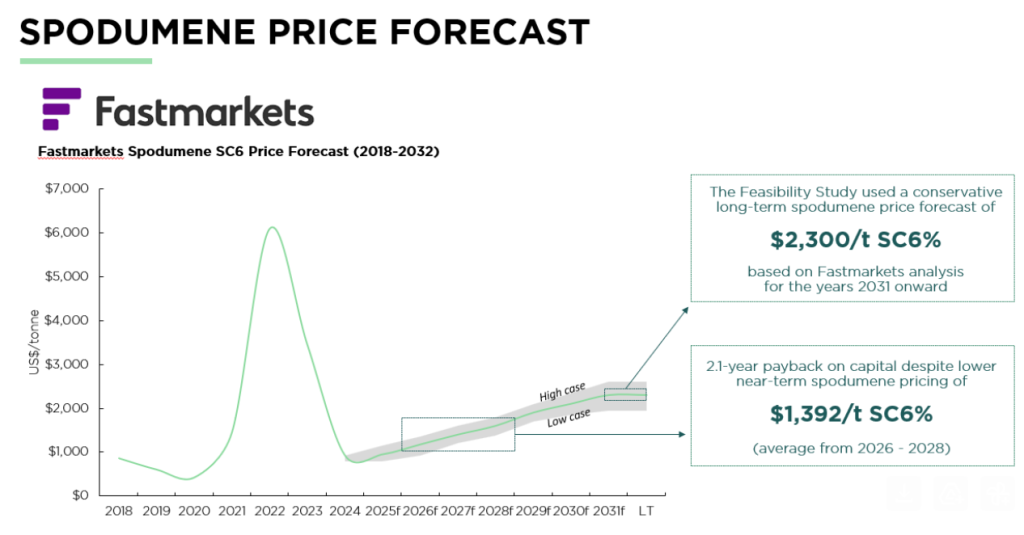 Fastmarkets’ 2025 long-term spodumene concentrate (“SC6”) price forecast assumes US$1,392/t SC6, CIF China, in H2 2027. Please note, if one doesn’t believe we will revert to US$2,000+/t spod con by the late 2020s, one shouldn’t invest in Li juniors!
