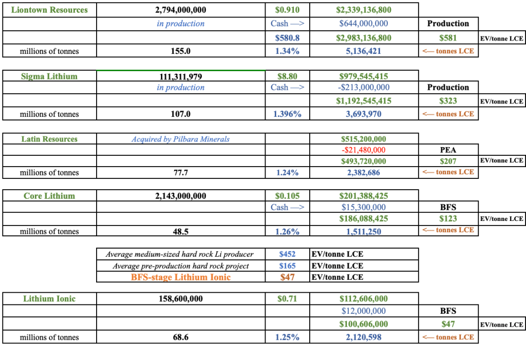 Lithium Ionic gets compared to nearby producer Sigma, which has 74% more resource tonnes, but is valued 6.8x higher on an EV/tonne basis. See chart below.